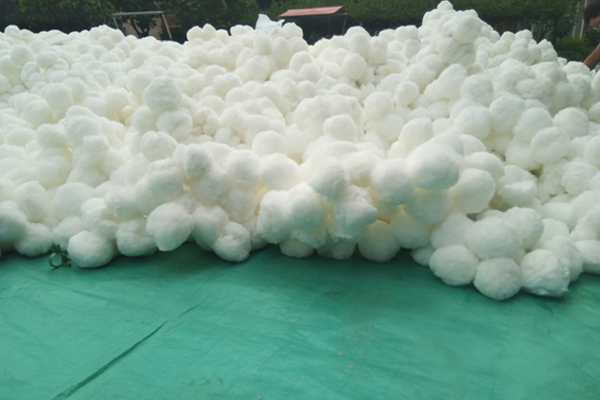 ? ? 改性纖維球濾料是由改性纖維絲結扎而成的。是由含量在35%~85%之間的二和三單體的共聚物紡絲制得的改性纖維絲束經過預熱 → 蒸汽牽伸 → 水洗 → 烘干 → 熱定形 → 卷曲 → 分絲 → 扎結→剪斷→包裝等工藝加工而成。改性纖維絲的性能似羊毛,彈性較好,伸長20%時回彈率仍可保持65%,蓬松卷曲而柔軟,有合成羊毛之稱。強度 22.1~48.5cN/dtex,比羊毛高1~2.5倍。耐曬性能優良,露天曝曬一年,強度僅下降20%,以此種纖維制作成的纖維球彈性好,比表面積大,空隙率高,濾速可調節,是水質高精度過濾的。